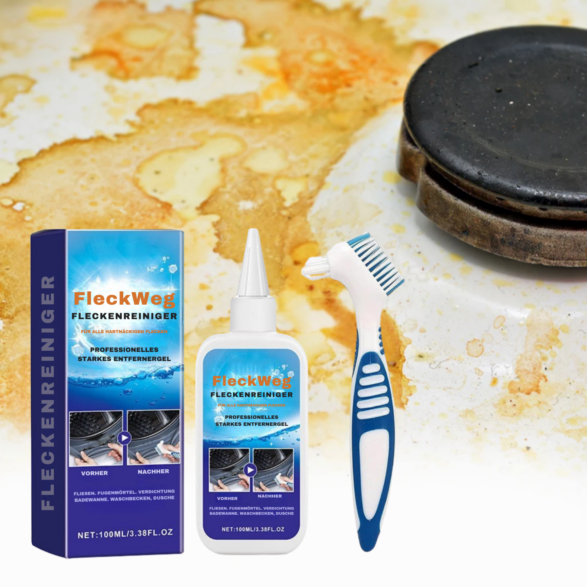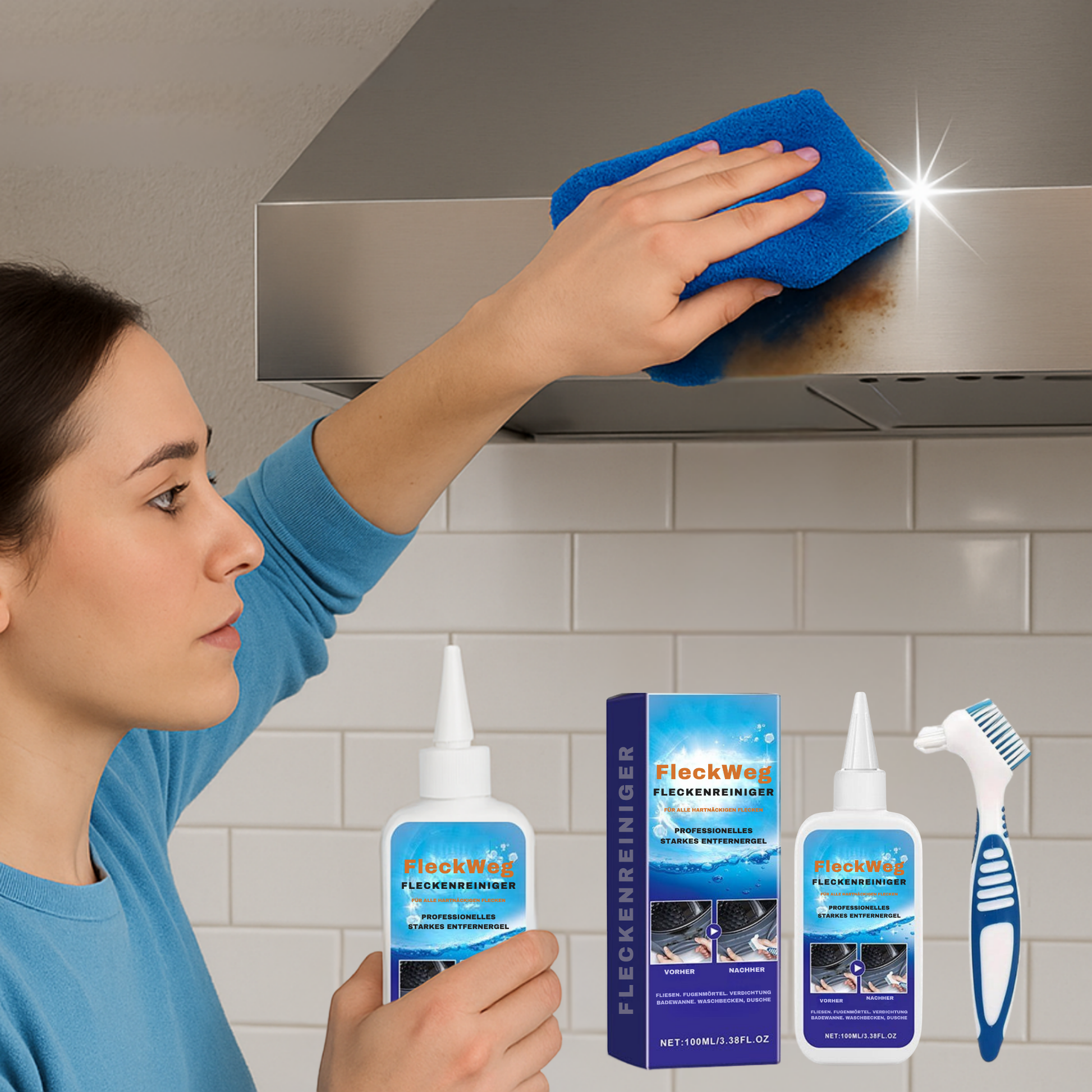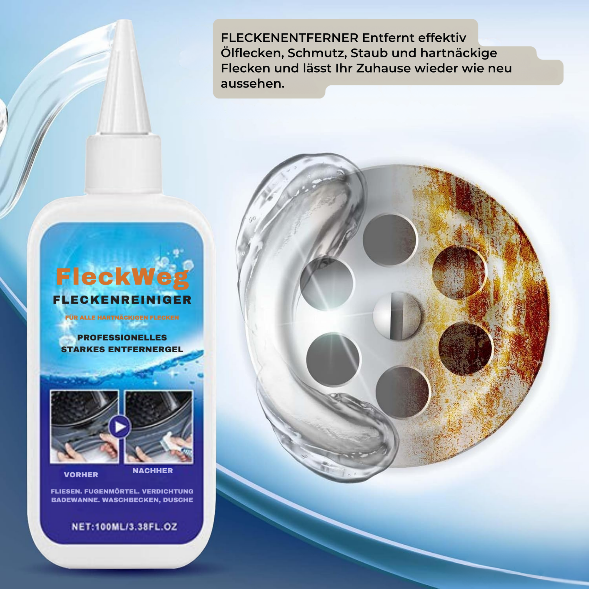 Sag Schimmel, Feuchtigkeitsflecken und hartnäckigem Schmutz Lebewohl! Das kraftvolle FleckWeg-Gel haftet zuverlässig auf Oberflächen, dringt tief ein und entfernt Flecken – ganz ohne Anstrengung.
