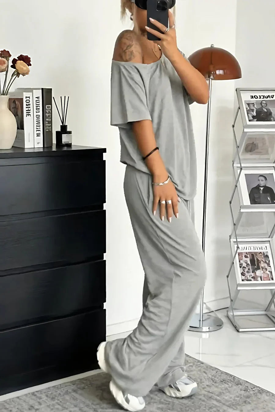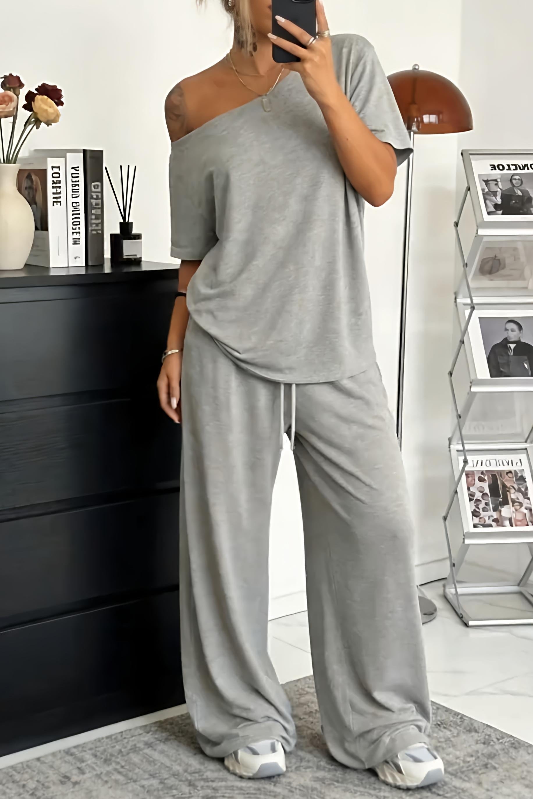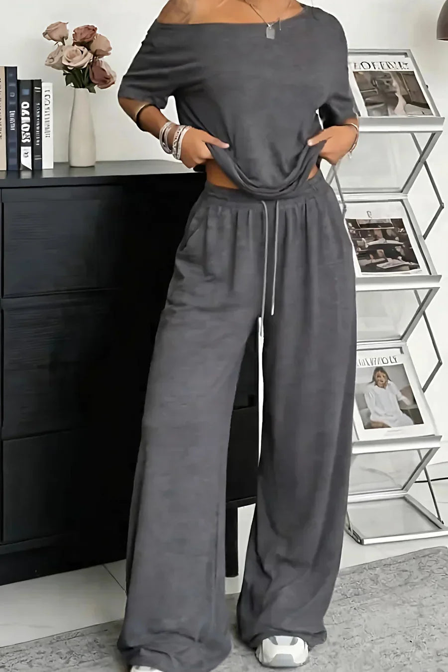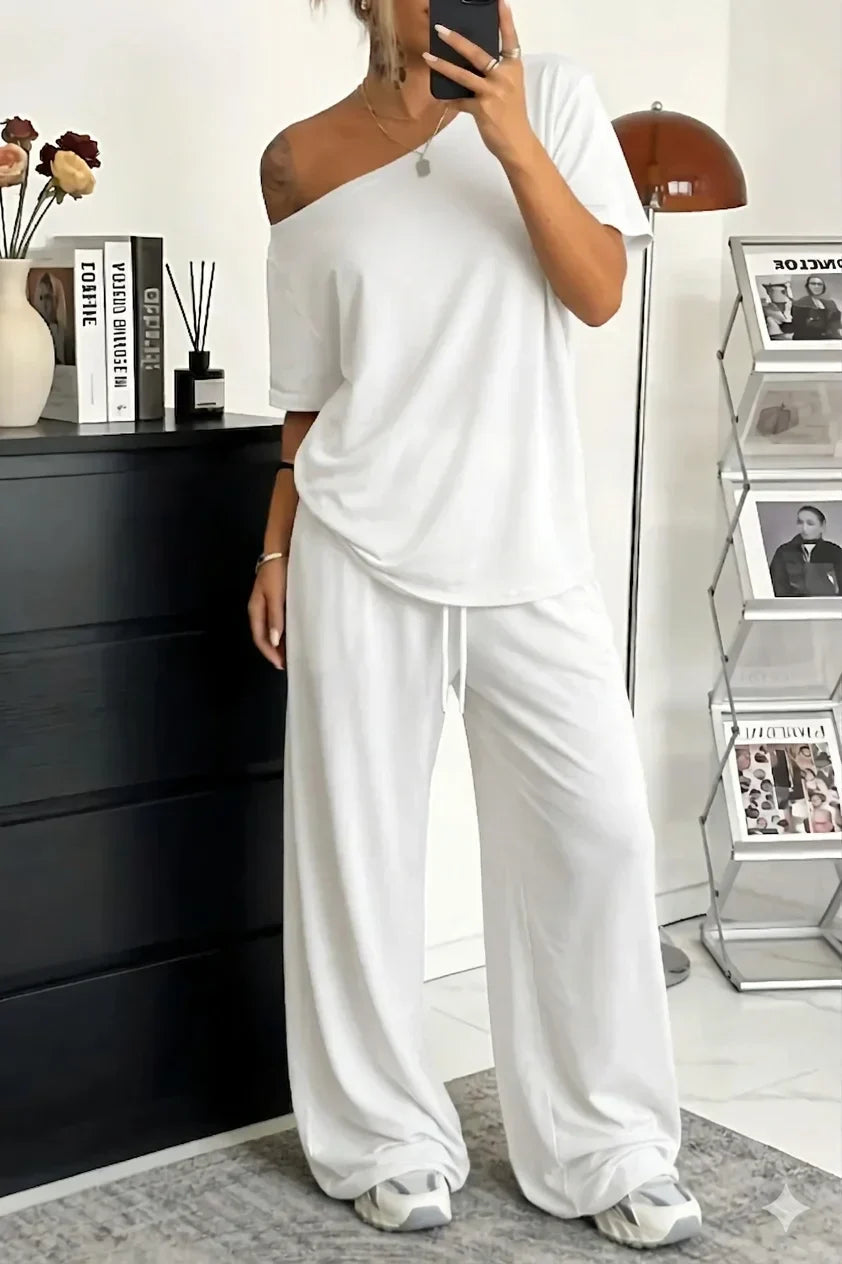 Fühlen Sie sich leicht und unbeschwert in dem Khairina-Zweiteiler mit schulterfreiem Ausschnitt – für täglichen Tragekomfort!