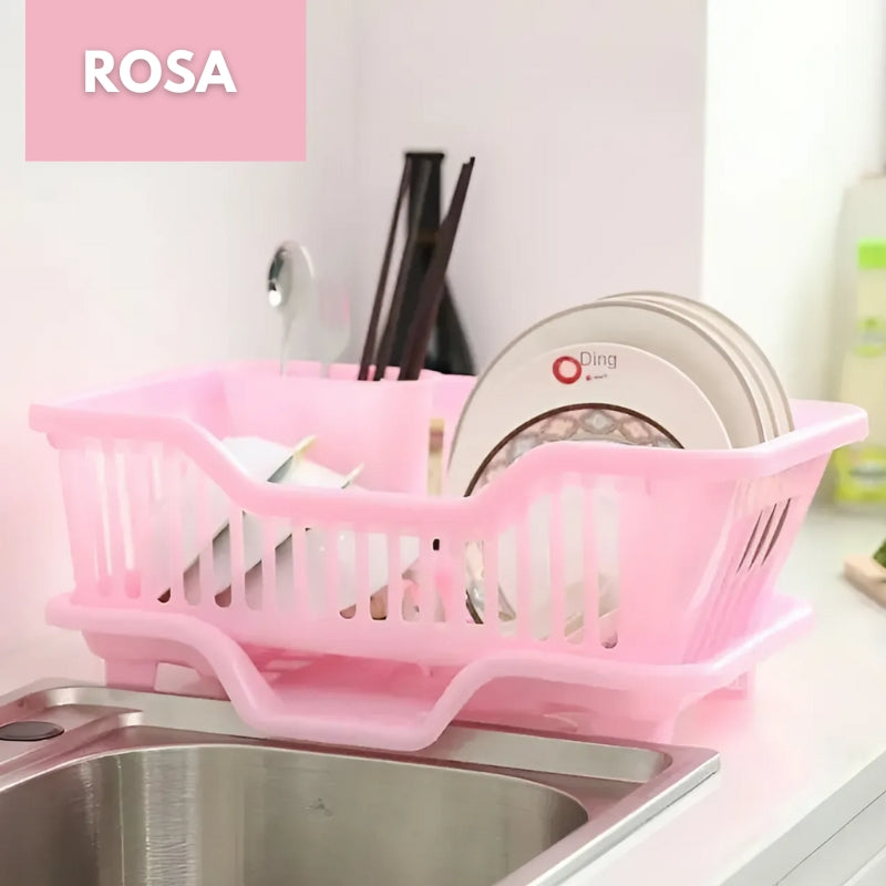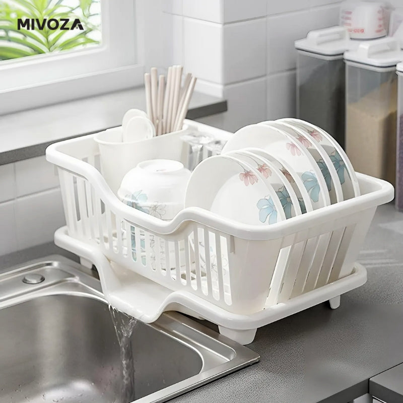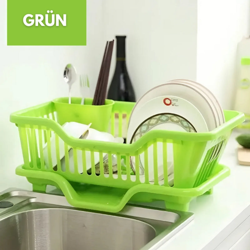 ✔ Integriertes Abtropfsystem: Erhöhte Rippen und ein schwenkbarer Ausguss leiten das Wasser in die Spüle, während der abnehmbare Tellerhalter und der Besteckhalter die Reinigung erleichtern.